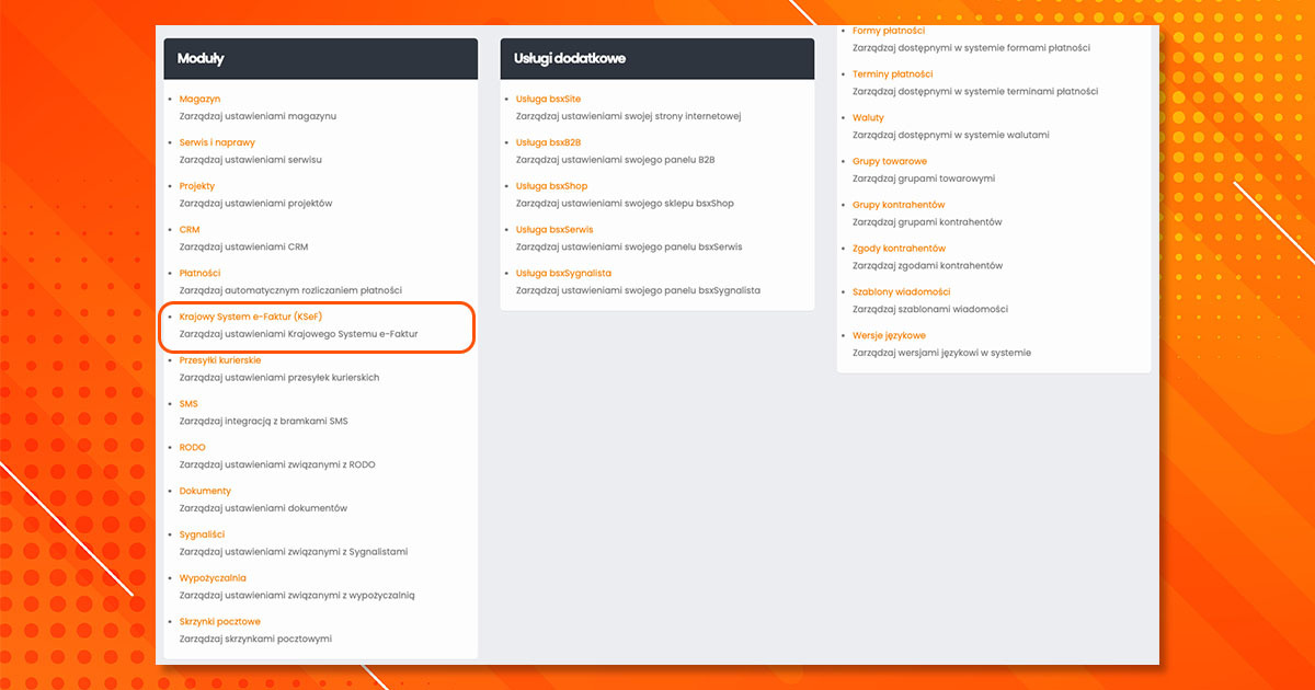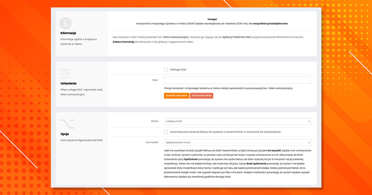 Przejdź do Modułów → Krajowy System e-Faktur (KSeF). System automatycznie zarządza ustawieniami Krajowego Systemu e-Faktur.