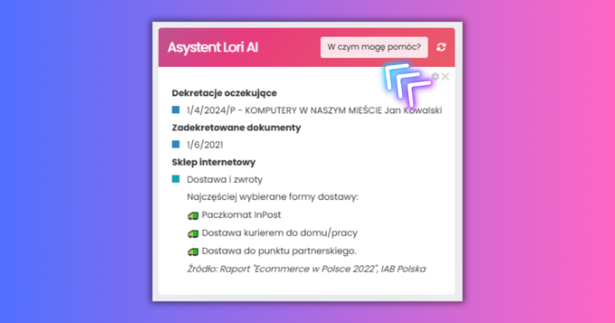 W górnej belce tej sekcji znajdziesz jej nazwę: Asystent Lori AI, przycisk: W czym mogę pomóc? oraz ikonkę dwóch strzałek, które są przyciskiem odśwież.