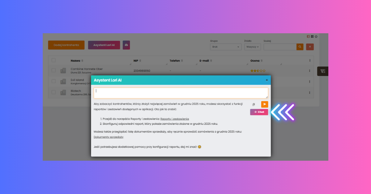 Z Asystentem Lori AI komunikuj się dokładnie tak samo, jak komunikowałbyś się ze współpracownikami. Pisz do Lori AI po polsku, naturalnie tak - jak pisałbyś do swojego asystenta. Co ważne, możesz skorzystać z Pomysłów makro i jeszcze ułatwić sobie komunikację z Lori AI.
